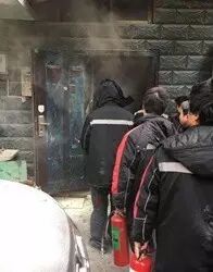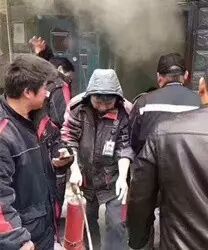 拥挤厨房内,三人拿着灭火器向明火处喷洒。厨房外,十几位同事排着队,每人手里拎一罐灭火器,随时准备支援。随后消防赶到,成功控制火情。