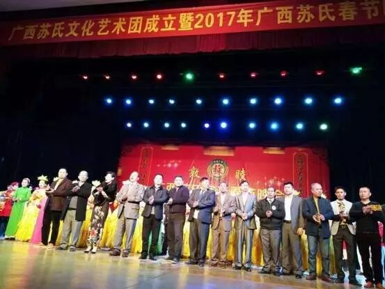 2017年2月8日晚8时,广西苏氏宗亲联谊会在玉林市万花剧场主办的2017年广西苏氏春节晚会,隆重宣告广西苏氏文化艺术团的成立。这是一场具有历史意义的盛会,标志着广西苏氏文化发展又上了一个新台阶!