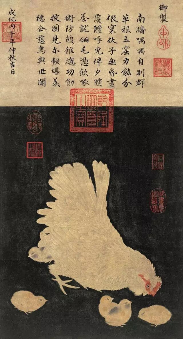 鸡形象大量出现的艺术品,除了陶瓷外,还有传统绘画。在宋代留存至今的花鸟画中,有一幅著名画家王凝的《子母鸡图》及另一幅作者佚名的同名作品,均以写实的手法刻画细腻,设色雅致,将母鸡对雏鸡的呵护表现得淋漓尽致。明清时期的画鸡名家有八大山人、郎世宁等。八大山人的作品重写意,个性极强,充满斗志和倔强之气。郎世宁引入西方油画技法,融合中国传统技法画鸡,别具一格,影响深远。