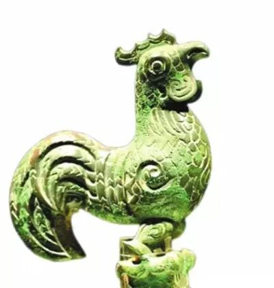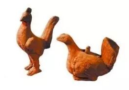 近年来,在长江流域和黄河流域的文化遗址中,都发现了陶制鸡形器。如在江苏邳州大墩子古文化遗址最下层(距今约6000年),出土了一只正蹲在窝里下蛋的陶鸡。青铜鸡则出土于四川广汉三星堆遗址,实物为昂首挺胸的雄鸡,造型风格颇为写实。因这只青铜雄鸡出土于二号祭祀坑,同坑还出土了众多为青铜树附件的青铜鸟,令人不由想起“扶桑”和“天鸡”、“玉鸡”、“金鸡”的神话传说。