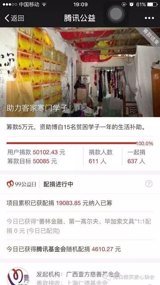 “99公益”慈善募捐项目于9日晚7时许圆满完成预期筹款目标,此次筹款目标50085元,共筹款50120.43元,项目累积获得腾讯公益平台配捐19083.85元超额完成了任务,我们脚踏实地完成了一个小目标。