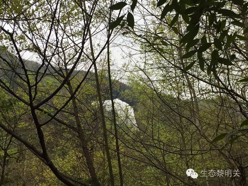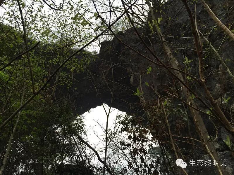 翻过一个山头,远远看见一座石桥横跨两个山头,向导讲,当地人叫天生桥,别看桥好似就在眼前,距离可不近哩!