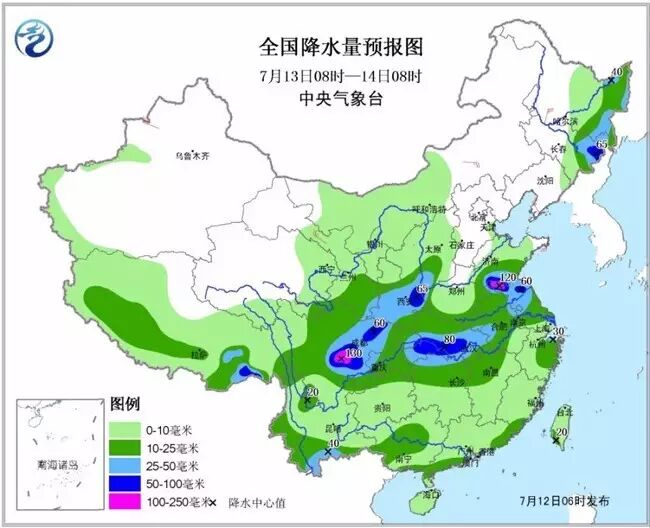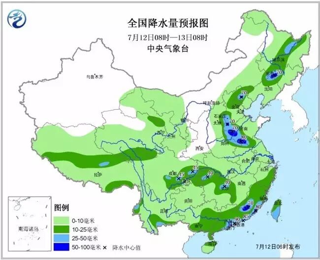 12日08时至13日08时,华北南部和东北部、黄淮中部、东北地区中部、四川盆地东部和南部、江南西北部和东南部、华南中东部、青海东北部和南部、西藏中部和东南部等地有中到大雨,其中,华北东北部和南部、河南东北部、江苏西北部、安徽北部、福建南部和华南沿海等地的局部地区有暴雨(50~90毫米);上述部分地区伴有短时强降水、雷暴大风或冰雹等强对流天气。