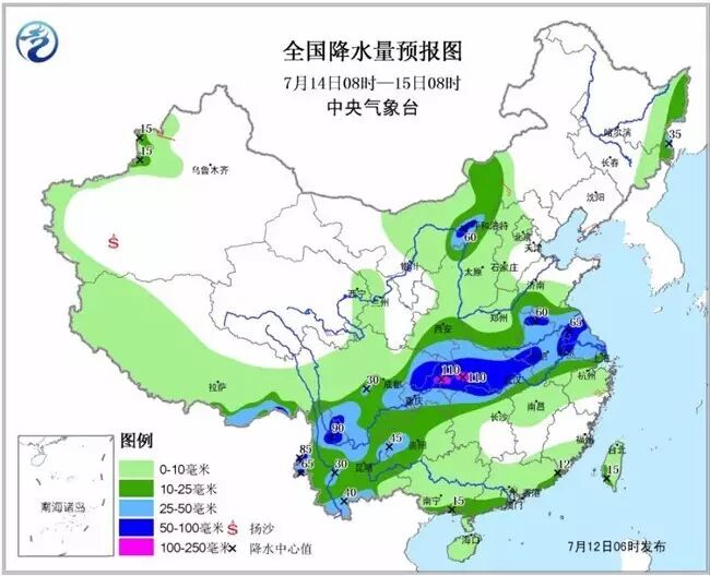 14日08时至15日08时,黄淮中部、江汉、江淮、江南北部、西南地区东部和南部、川西高原南部、内蒙古中部、陕西南部、华南沿海地区以及新疆伊犁河谷、西藏东南部等地有中到大雨,其中,内蒙古中部偏南地区、安徽中北部、江苏中部、湖北中南部、重庆北部、四川东北部、云南西北部等地的部分地区有暴雨,局地大暴雨(100~110毫米);上述部分地区伴有短时强降水、雷暴大风或冰雹等强对流天气。