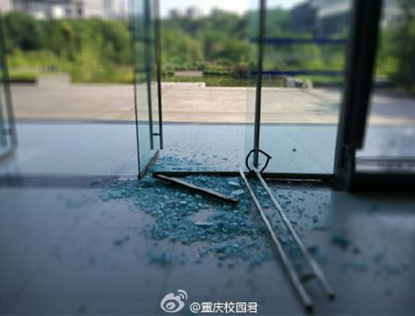 10日,重庆理工大学教学楼玻璃门被热炸了。(图片来源:微博@重庆校园君)