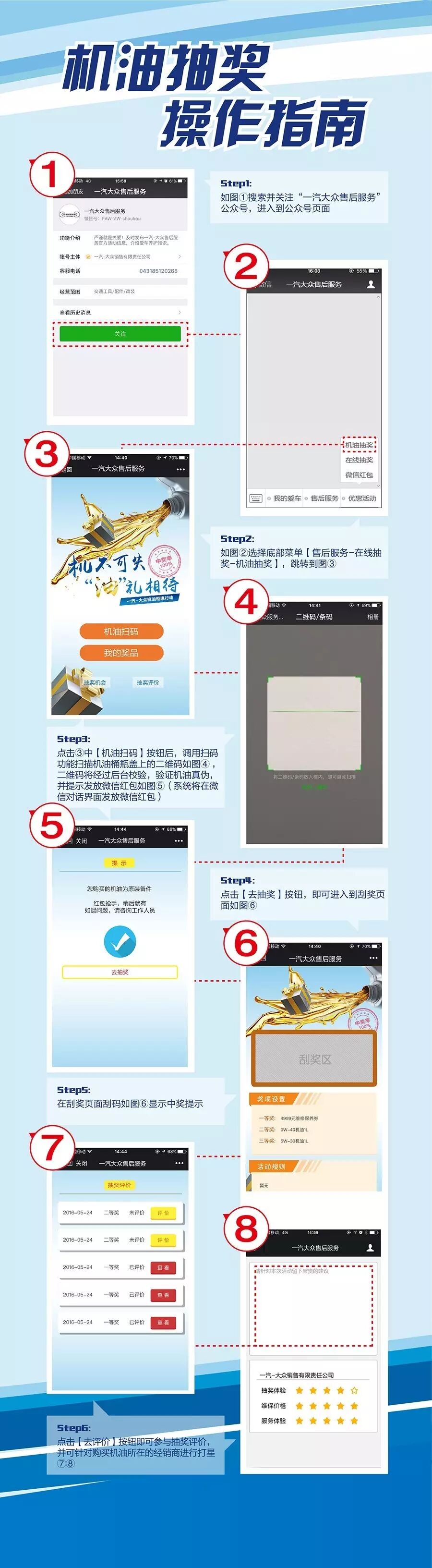 Step2: 进入公众号界面,点击“优惠活动”下“机油抽奖”按钮进入活动界面,通过“机油扫码”,扫描瓶盖二维码,即可辨别机油真伪,并领取微信红包一份,微信红包中奖率百分之百;