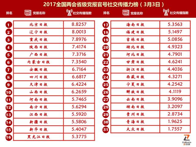 3月3日,在各分项指标中,省级党报官方微信微博指数排名前五的省级党报分别为海南日报、江西日报、天津日报、四川日报、河南日报,其中,泽传媒微博指数ZBI突破400的包含四川日报、海南日报、河南日报,泽传媒微信指数ZCI突破400的包含海南日报、河北日报、南方日报、江西日报;、陕西日报、辽宁日报(陕西与辽宁并列第二)、重庆日报、广西日报、内蒙古日报、黑龙江日报(后四项并列第四);、北京日报、内蒙古日报(北京与内蒙古并列第二)、重庆日报、陕西日报、广西日报(后两项并列第五);习式热词指数排名前五的省级党报分别为内蒙古日报、北京日报、陕西日报(北京与陕西并列第二)、辽宁日报、安徽日报、西藏日报(后两项并列第五)。