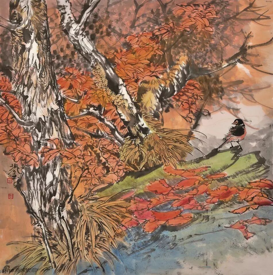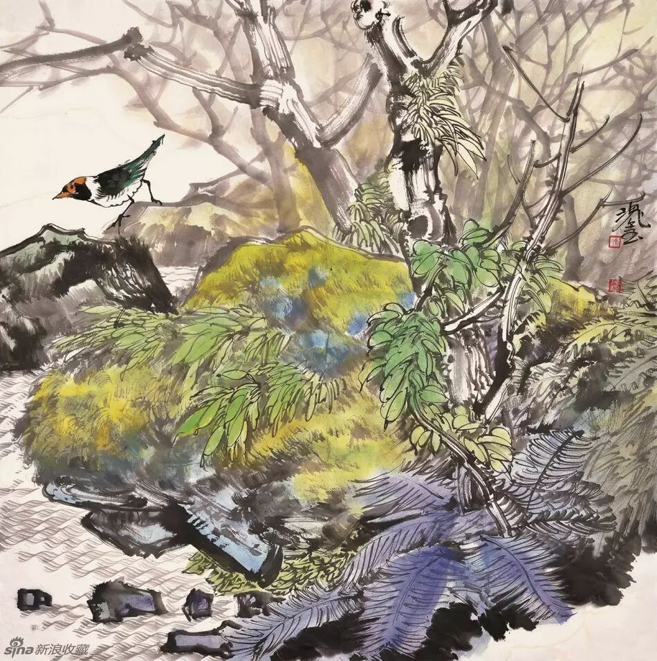 画面容量大、空间深,画面更为丰富,增加了画面整体结构的视觉张力与气势,葱茏透逸,野趣盎然,呈现出无边界特色的时代“大花鸟”。