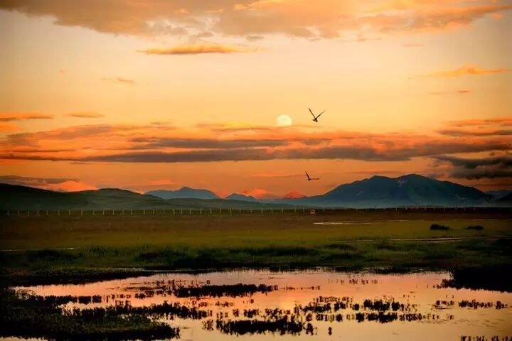 初秋时节,逐渐枯黄的尕海草原,在水天一色中显得格外平静温柔,湛蓝的湖面上倒映着连绵的山脉,在夕阳的余晖下又像油画般浓重。