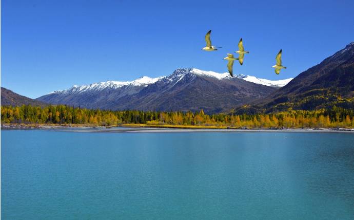深绿的山坡上透出一片片黄枝红叶相间、青山白雪相连的色块,烘托着山顶耀眼的雪色,投映在翡翠石般的喀纳斯湖上,光彩夺目,令人沉醉。