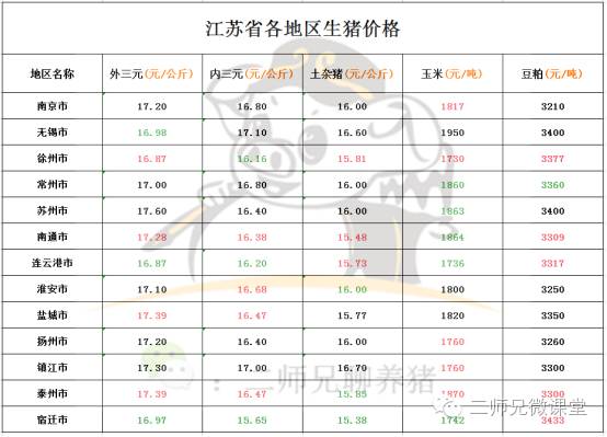 江苏省各市外三元生猪价格如下:最高苏州市17.60元/公斤,最低徐州市16.87元/公斤,截止11月17号为止江苏省外三元生猪平均价格为17.11元每公斤左右。