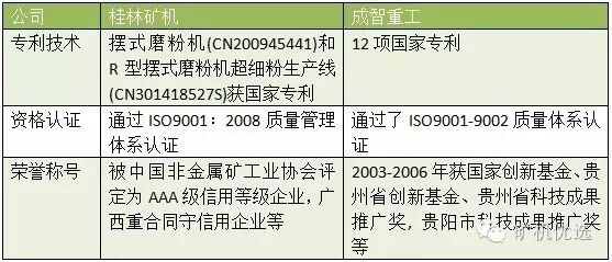 桂林矿机和成智重工均是中国西南地区的矿山设备制造商,在成立时间和生产规模上,前者更胜一筹,但后者较多的高级工程人员为其设备技术的研发创造了条件。两者都通过了ISO9001国际质量管理体系认证,这也为其产品质量提供了一定的证明。专利技术的研发是它们不断的追求,成智重工在发展的十余年的中荣获了12项国家专利,桂林矿机也在摆式磨粉机领域取得了一定成就。