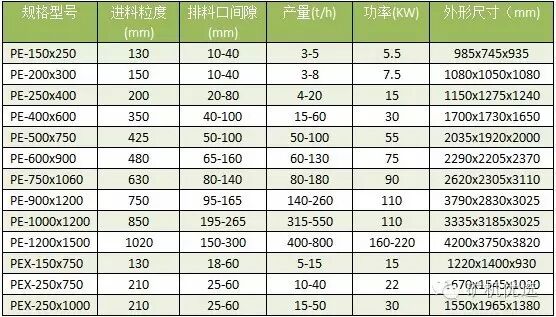 桂林矿机的PE鄂破可加工抗压强度在320Mpa以下的各种矿物和岩石,有十几种不同的型号,可满足多行业的生产要求。常用的鄂破型号,如PE500*750、PE600*900、PE1000*1200等,它都可以提供。其鄂破最大的生产能力可达800t/h(PE1200*1500),可处理粒度在1020mm以下的物料,出料粒度在10-300mm之间,具体可参看以下参数表: