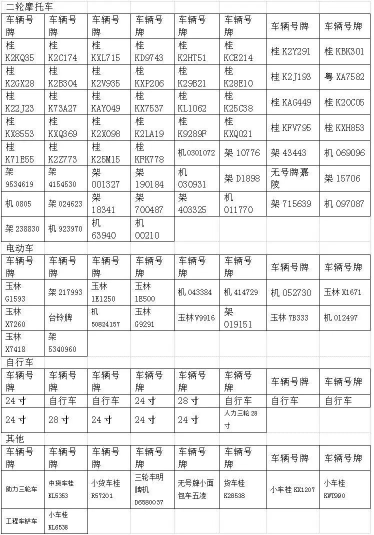 玉林市交警支队直属二大队于2016年04月至08月份依法暂扣一批造成交通事故的车辆,至今未有当事人前来处理。现向社会公告,如在公告后三个月内仍不来接受处理的,。