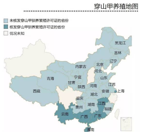 截至2017年3月28日,有16个省份回复南方周末记者,称未核发过穿山甲驯养繁殖许可证。但检索工商资料,发现十余家企业经营范围包括穿山甲养殖,网上也能搜到一些机构自称养殖穿山甲。