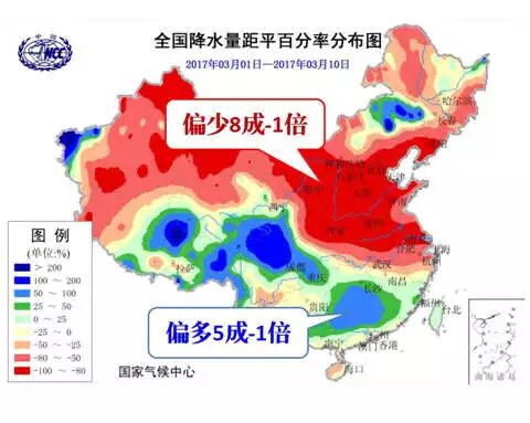 进入3月,南方的雨水就在跃跃欲试。三月上旬,湖南贵州这一带就出现了雨水偏多的情况。而与此同时,长江以北的北方大部地区,雨水非常稀少,冬麦区缺水风险加大。