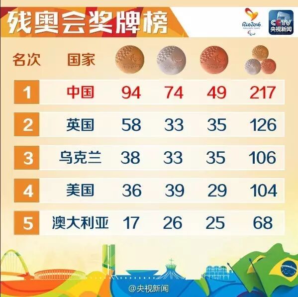 正在巴西里约热内卢举行的残奥会中,中国军团继续领跑奖牌榜。目前,中国累计获94金74银49铜,共217枚奖牌,暂列金牌榜、奖牌榜第一。