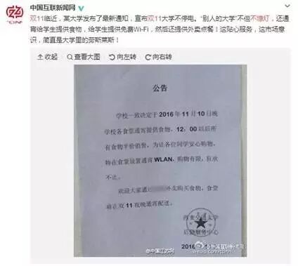 11月6日晚广西财经学院官微就发出公告称学校并无相关的双十一断网限制消费的通知,请大家不要相信谣言,并停止谣言的传播。