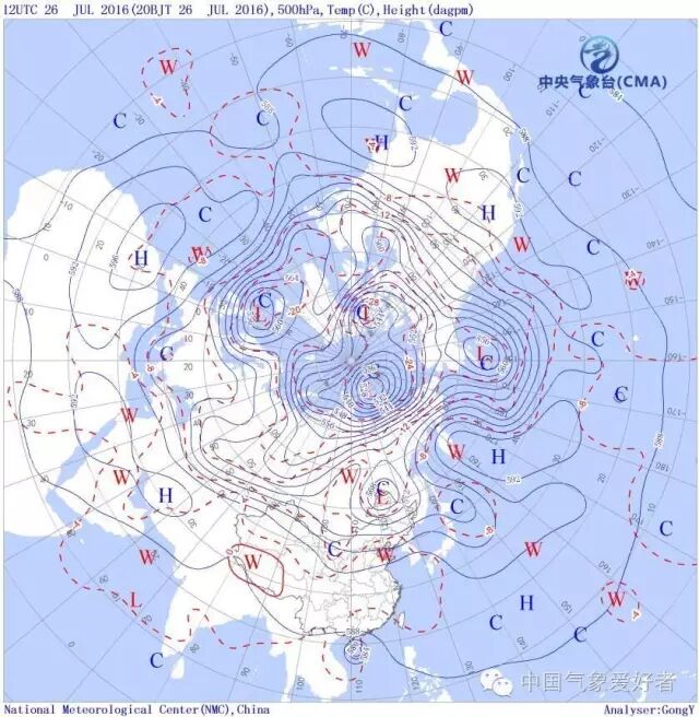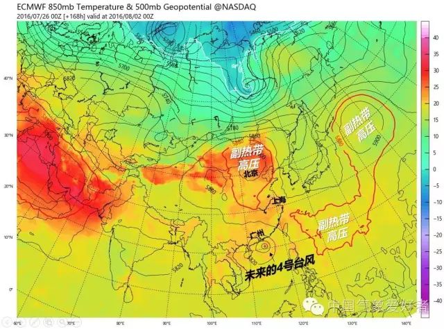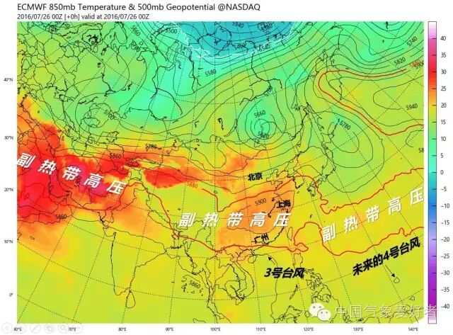 今天(7月26号)早晨和晚上的形势,第一张图上,红线为副热带高压势力范围,第二张图上,588线为副高范围。可见,今天副热带高压极为强盛,已围绕地球连成一圈。第一张底图由nasdaq制作