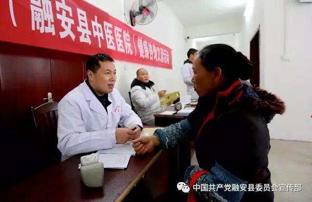 1月11日,一名医生为融安县沙子乡群众诊脉。新年将至,广西柳州市工人医院和融安县中医医院联合组建多支义诊小分队,分别到融安县12个乡镇开展春节前健康咨询义诊活动。当日,来自柳州市工人医院派驻融安县中医医院的内科、外科等科别的6位临床专家来到沙子乡卫生院,为当地群众免费提供身体检查、健康咨询、医疗保健等义诊服务。