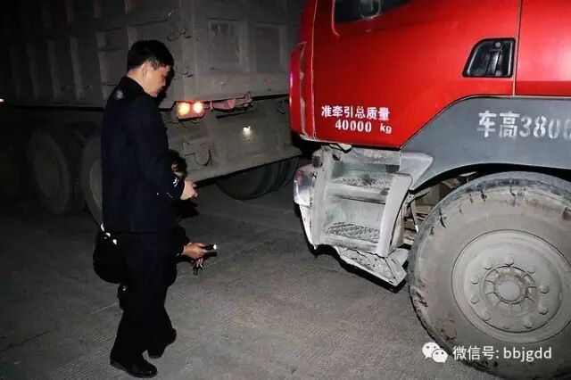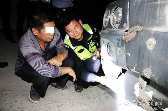 经对四辆大货车上留下的物证、痕迹与事故现场进行比对核查后,民警连夜对四名驾驶人逐一进行询问,寻找肇事第一辆车,四人均承认自己是驾车经过了现场,但未承认自己就是驾车肇事第一人!于是民警便将涉嫌的桂K38XXX车号大货车驾驶人带到车前,解释当时现场的情况。