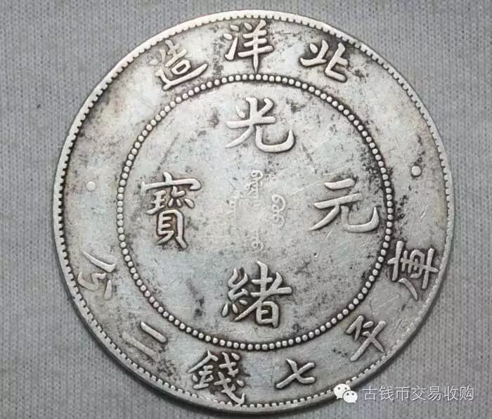 钱面:珠圈内满汉文“光绪银元”,上环“北洋造”, 下环“库平七钱二分” “光绪元宝”四个字,字体俊秀。 [光]字最后一笔竖弯勾,做了一个鸟的造型,鸟嘴紧连[光]字一瞥。光绪的[绪]字中间那一瞥,仿佛刀柄,一刀刺进了[绪]字的心脏。[元]字,锤击鸟眼,有吸干大清元气之意。 [宝]字的宝盖上面一点,探出宝盖下方,字体写的柔弱飘逸。