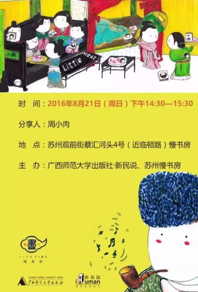 这个周末来慢书房看画吧!8月21日(周日下午)2点半,慢书房携手广西师范大学出版社-新民说,特邀周小肉作客慢书房,为我们带来一场绘本分享!