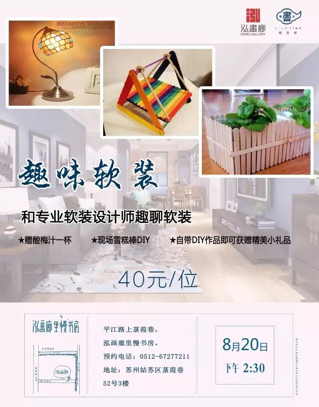 8月20日,周六下午两点半,专业软装设计师与你相约泓画廊里慢书房,一起聊聊软装,用雪糕棒动手DIY绿植座,如果您有制作好的手工带来,还有机会领取精美礼品(数量有限送完为止)有兴趣的小伙伴约起来哟!