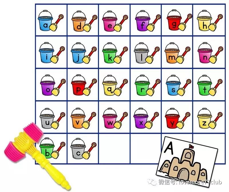 3.能读出字母,并找出对应大小写卡片的选手,要迅速出击,敲打那张沙滩玩具“地鼠”卡,如果判断是正确的,就可以赢得这张卡片。