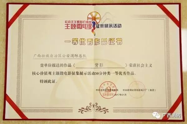 1月19日下午,。广西消防总队报送以杨科璋烈士为原型的微电影《背影》荣获30分钟类一等优秀作品奖。