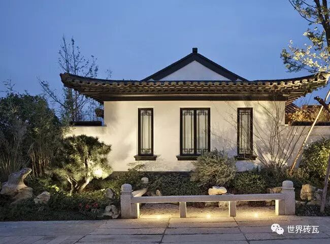 中式别墅,那一袭清雅淡静的粉墙黛瓦,真如宣纸落墨般的意境,一霎时“焦、浓、重、淡、轻”五墨杂陈,好一幅“既白当黑”的水墨江南!墨色的瓦好像是书法的线条,而粉墙则仿若大片的虚空留白,笔墨回转中,是说不尽的意境与韵致。