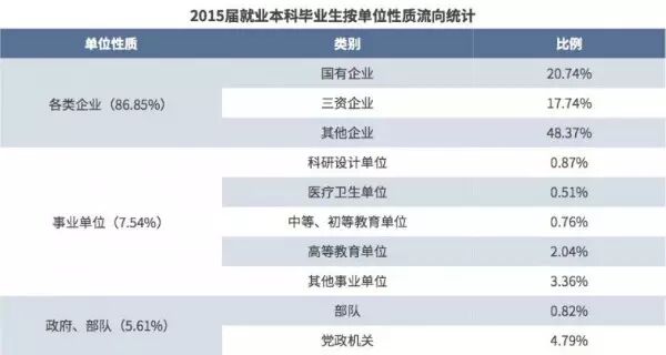 2015届本科毕业生的行业流向总体格局与近几年基本相似,仍主要集中于各类企业,达到86.85%。