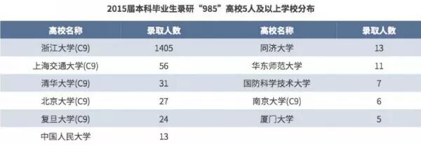 境内录研的同学中,有1631名本科生升学至国内985高校,占92.25%,,占2.83%。录取人数5人及以上的985高校和人数分布如下表所示: