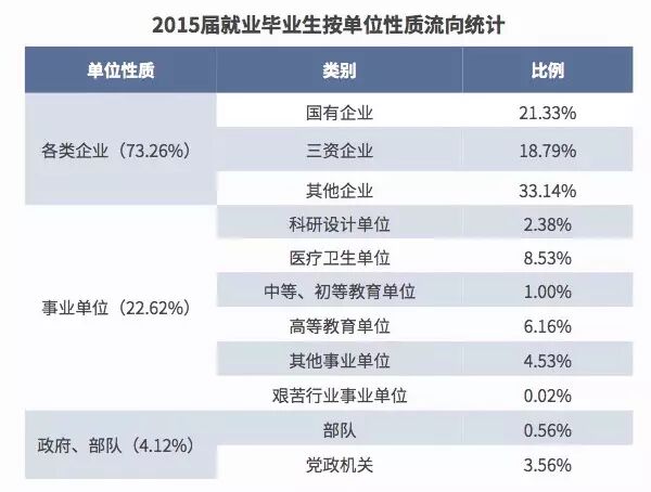 2015届就业毕业生主要单位性质流向为:73.26%进入各类企业,22.62%进入事业单位,另外4.12%进入政府、部队就业。各类企业是我校毕业生的主要就业去向。