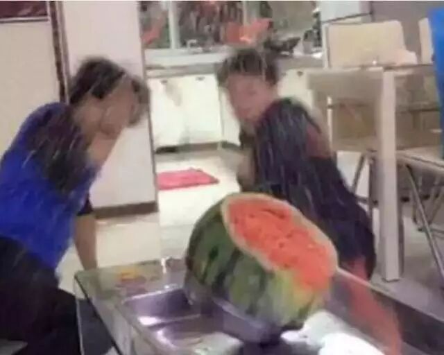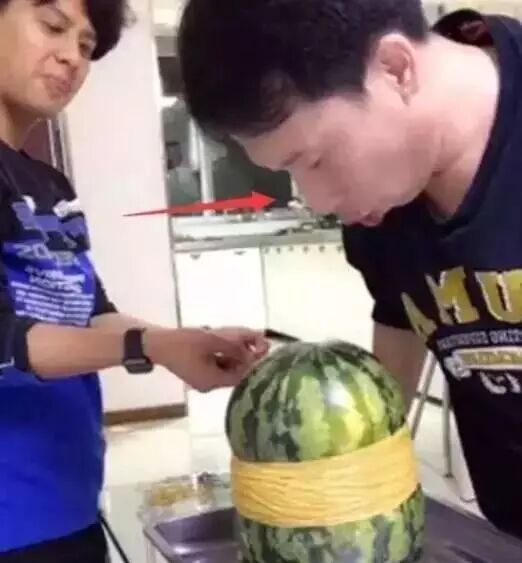 可能是受到启发,近日两位中国的网友也买来一个西瓜和若干皮筋,打算亲自实验一把这个有(wu)趣(liao)的实验。之前的一切都很顺利,两人小心翼翼的绑着皮筋,西瓜随着皮筋数量的增加逐渐挤压变形。直到绑到第728根的时候,这位好奇的小哥忍不住了,他凑上去看了一眼。