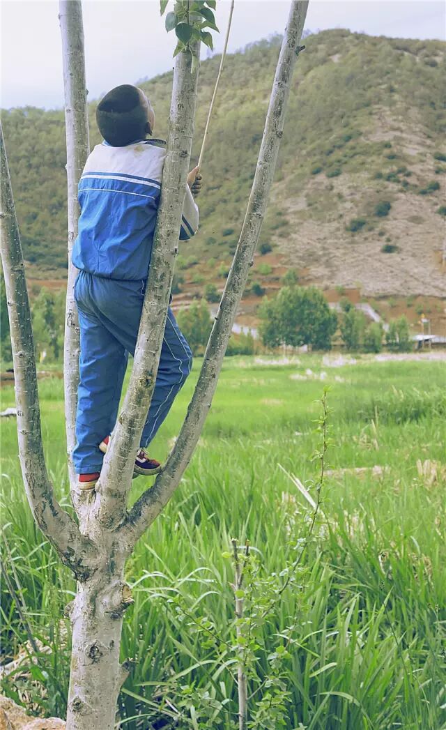 云南泸沽湖,小男孩爬到树上,好像是有什么果子。