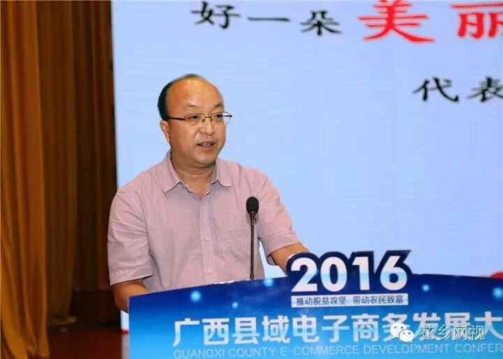 自治区主席陈武致辞并见证签约。陈武指出,今后,我区将把农村作为县域电商发展的主战场、主力军、主渠道,以更大的决心、更优的政策、更好的环境,全力推动农村电商快速发展,努力争当中西部县域电商发展排头兵,着力打造全国县域电商脱贫攻坚示范区。到2017年,争取农村电商覆盖率达到85%以上。到2020年,贫困地区基本实现县有电子商务公共服务中心或电子商务集聚区,乡镇有电子商务工作站,村有电子商务服务点,贫困户能通过电子商务销售自产产品、购买生产生活资料。