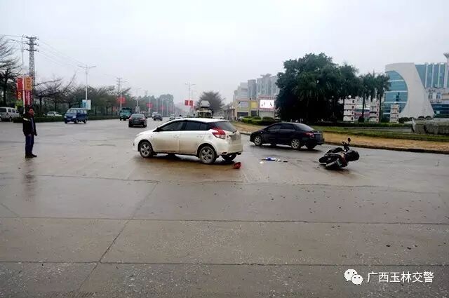 2017年3月12日上午8点42分左右,一辆白色轿车从玉林往福绵方向行驶,至该路口处,欲右转弯驶入天河路,与一辆同向行驶的电动自行车发生刮擦相撞,将电动自行车刮倒,电动自行车驾驶人受重伤。