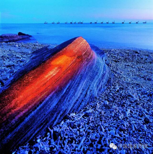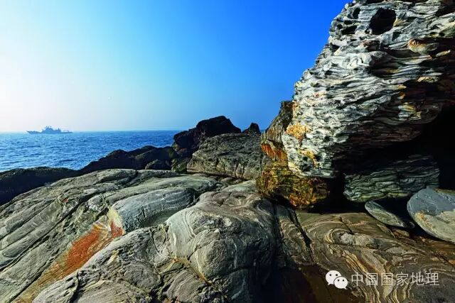 砣矶岛西南岸,大量的石头被“烙”上了海浪一样的纹理,这就是当地百姓所说的“彩石画廊”。