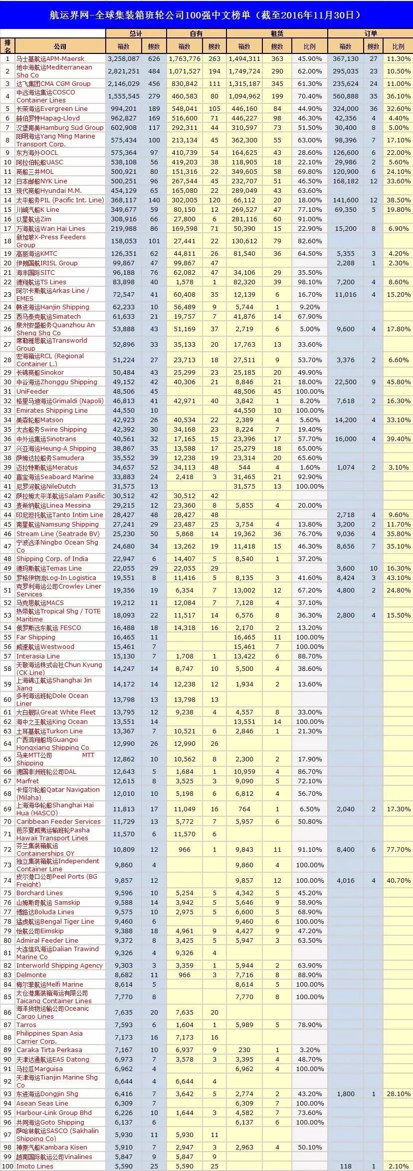 航运界网消息,根据Alphaliner最新运力数据显示,截止至2016年11月30日,全球班轮公司运力100强中马士基航运排第一,地中海航运排第二,法国达飞轮船排第三,整合后的中远海集运排在第四位,台湾长荣海运排第五,赫伯罗特排在第六。第七名到第十名分别是:汉堡南美、阳明海运、东方海外与阿拉伯轮船。进入破产保护程序的韩进海运排在第24位。