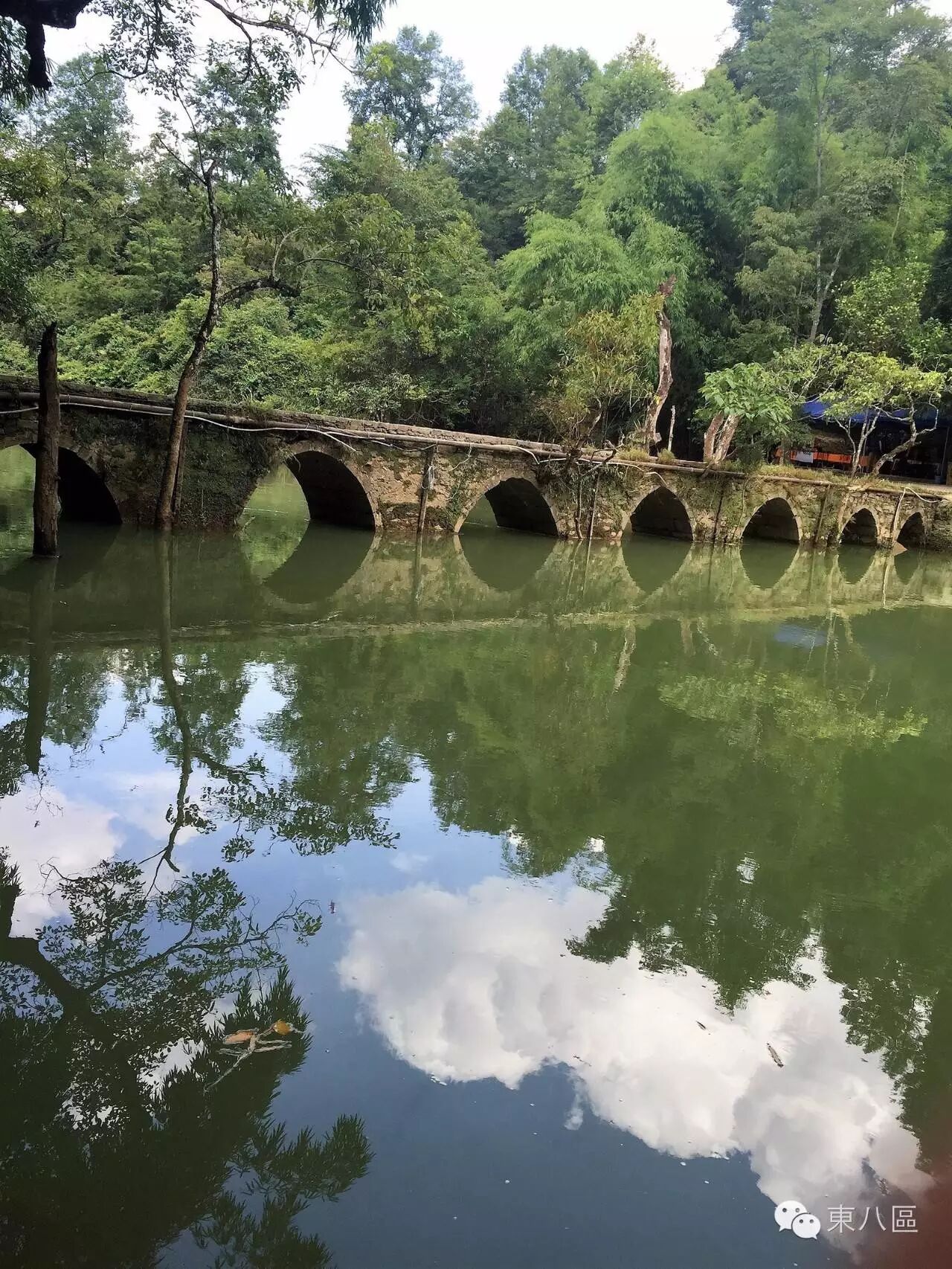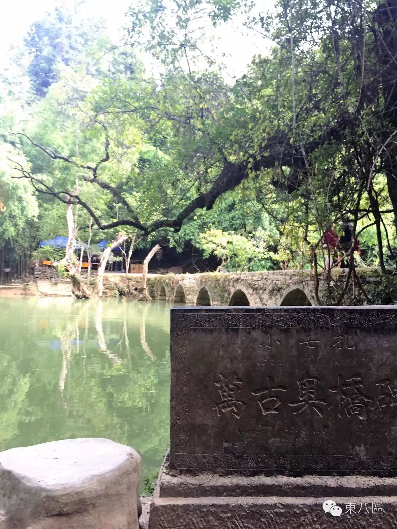 小七孔古桥,是一座小巧玲珑的七孔古石桥,桥身爬满藤蔓和蕨类;古色古香的桥下是绿得令人心醉的涵碧潭。