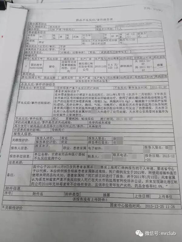 一份盖有公章、由甘肃省药品和医疗器械不良反应监测中心出具的《药品不良反应/事件报告表》(以下简称“报告表”)显示,2011年1月7日下午,田毅伟的父亲田某某,在甘肃省天水市皂郊镇新庄村输液治疗,输液十分钟后开始呕吐,扎针处肿大,胸闷气短,当晚死亡。