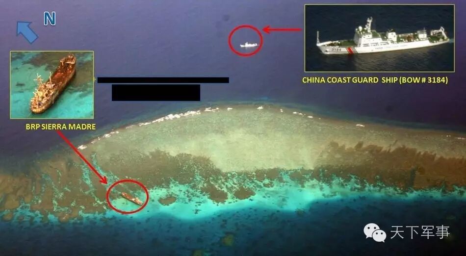 外媒上曝光的中国海军军舰与中国海警船在仁爱礁联合执法画面