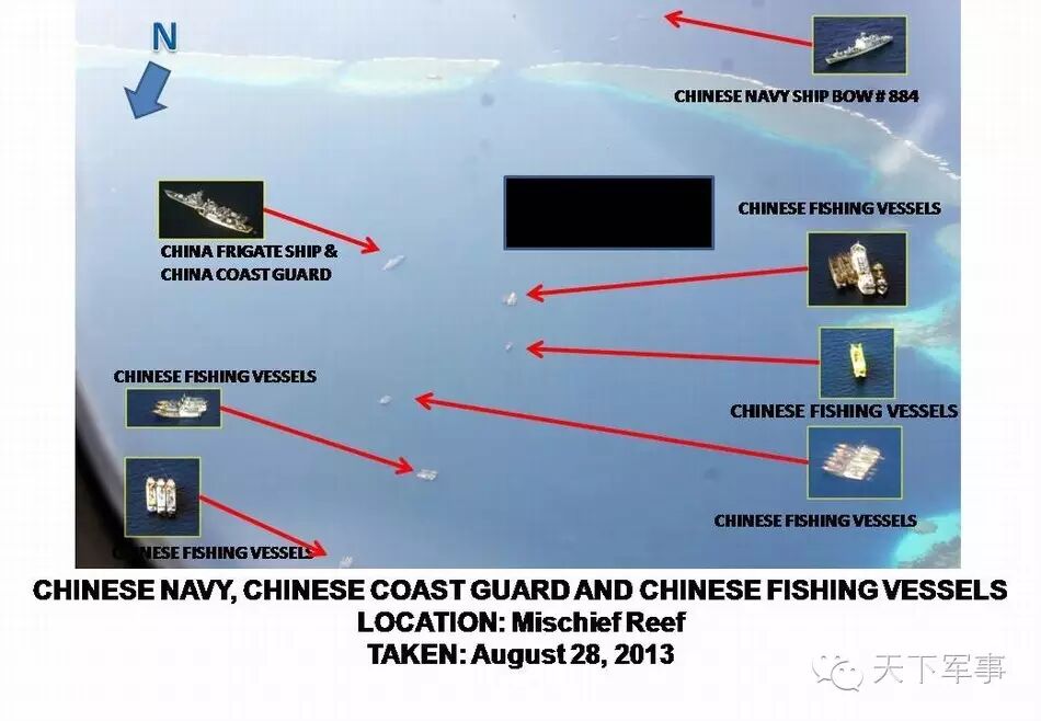 中国海军军舰与中国海警执法船在仁爱礁联合进行维权行动的航拍资料图。照片的拍摄时间是2013年8月下旬,当时正是中国与菲律宾在黄岩岛问题上关系最为紧张的时刻。从照片中可以看到,中国海军派出了一艘护卫舰和补给舰,与其他执法船一起联合执法。