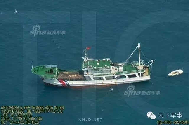 本次菲方在黄岩岛拍摄到的“海警3063”船。海警3063系渔船改装,主要用于在岛礁潟湖水域执法。