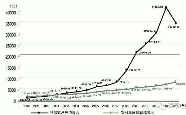 1998~2013年种烟农户户均收入和农村居民家庭人均纯收入