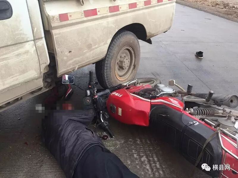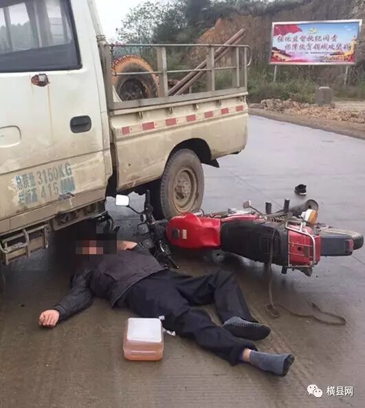 ▼事故照片:摩托车被压在货车左后轮,伤者躺在地上