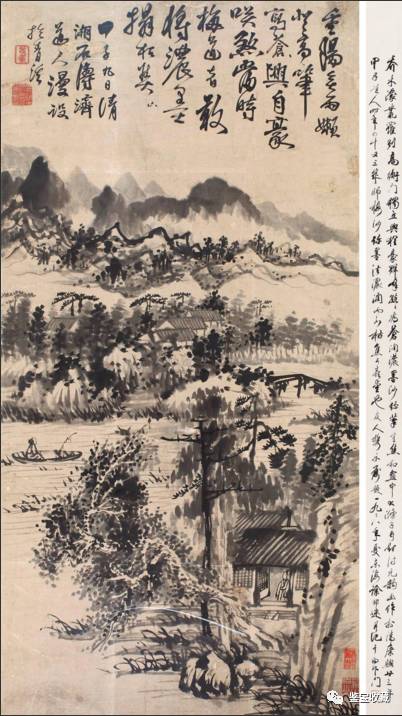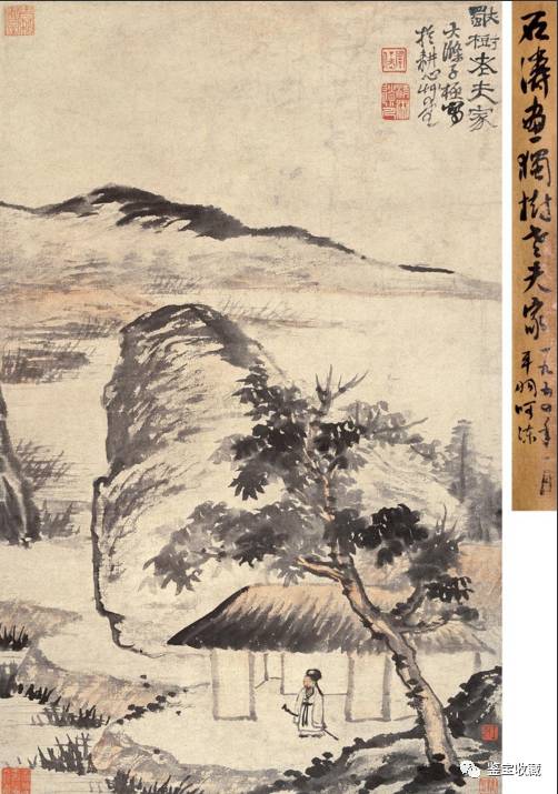 石涛《独树老夫家》曾见于徐平羽《玉莲斋藏画记》手稿:“纸本,墨笔,投色,高59公分,宽36.9公分。老树一株,苍翠遒劲,树下一屋,修整有致,屋前一人,执杖悠然,平坡进石,远水遥山,穆穆中无限生意,石公笔酣墨饱,横茂淋漓之作也。此帧于1953年冬以高值入行箧,装潢数月,1954春,始得斋头展对,喜极,喜极。”