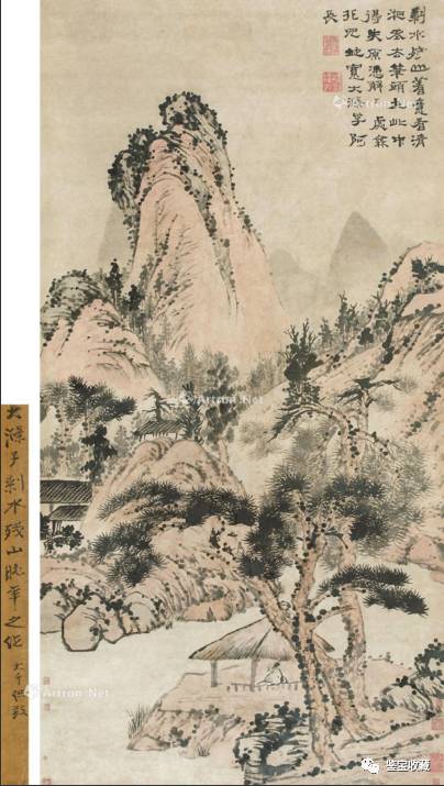 石涛此图,用秃笔硬毫所作,与习见者略异。但细绎其树石的骨法用笔,则仍是其自家风神。尤其山石点苔,淋漓苍劲,聚散有致,处处流露出力量和自信。书法亦用同一枝秃笔,虽未免生硬,但结体自然,依旧故我,确是他的真迹无疑。裱边有徐邦达先生鉴题,论断确切,尤足征信。石涛画传世赝鼎剧多,大千伪作,已算是其中佼佼者了,但跳脱轻薄,与这类原作相较,仍不可同日而语。