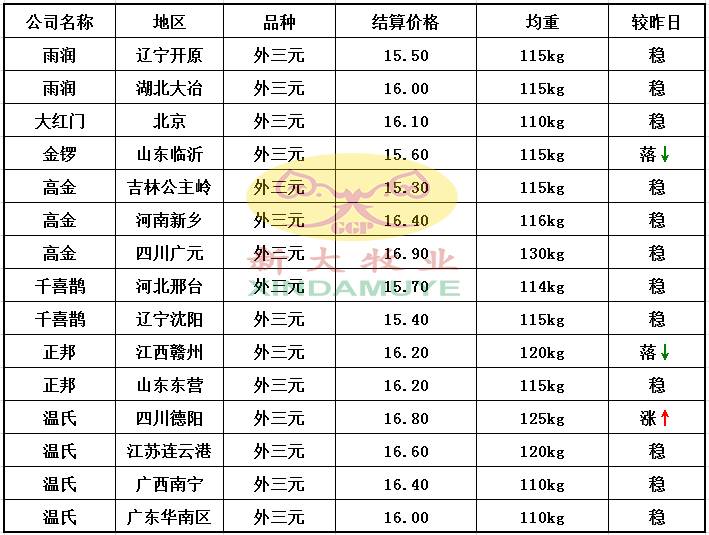 东北地区生猪价格今日整体持稳,个别低价区小幅上调结算价格,上涨幅度参考0.1元/公斤,终端消费不佳,走货有难度,当地屠宰企业调价意愿不强;京津生猪价格今日以稳为主,北京部分屠宰企业生猪结算价格参考16.00元/公斤左右,供需两低,短期猪价或趋稳;山东、河南等地区今日继续稳中现降,下调幅度参考0.1-0.3元/公斤,养殖户出栏积极性增加,当地屠宰企业降价后收购顺畅,部分有继续压价意向,短期猪价或有稳中微幅再降可能。